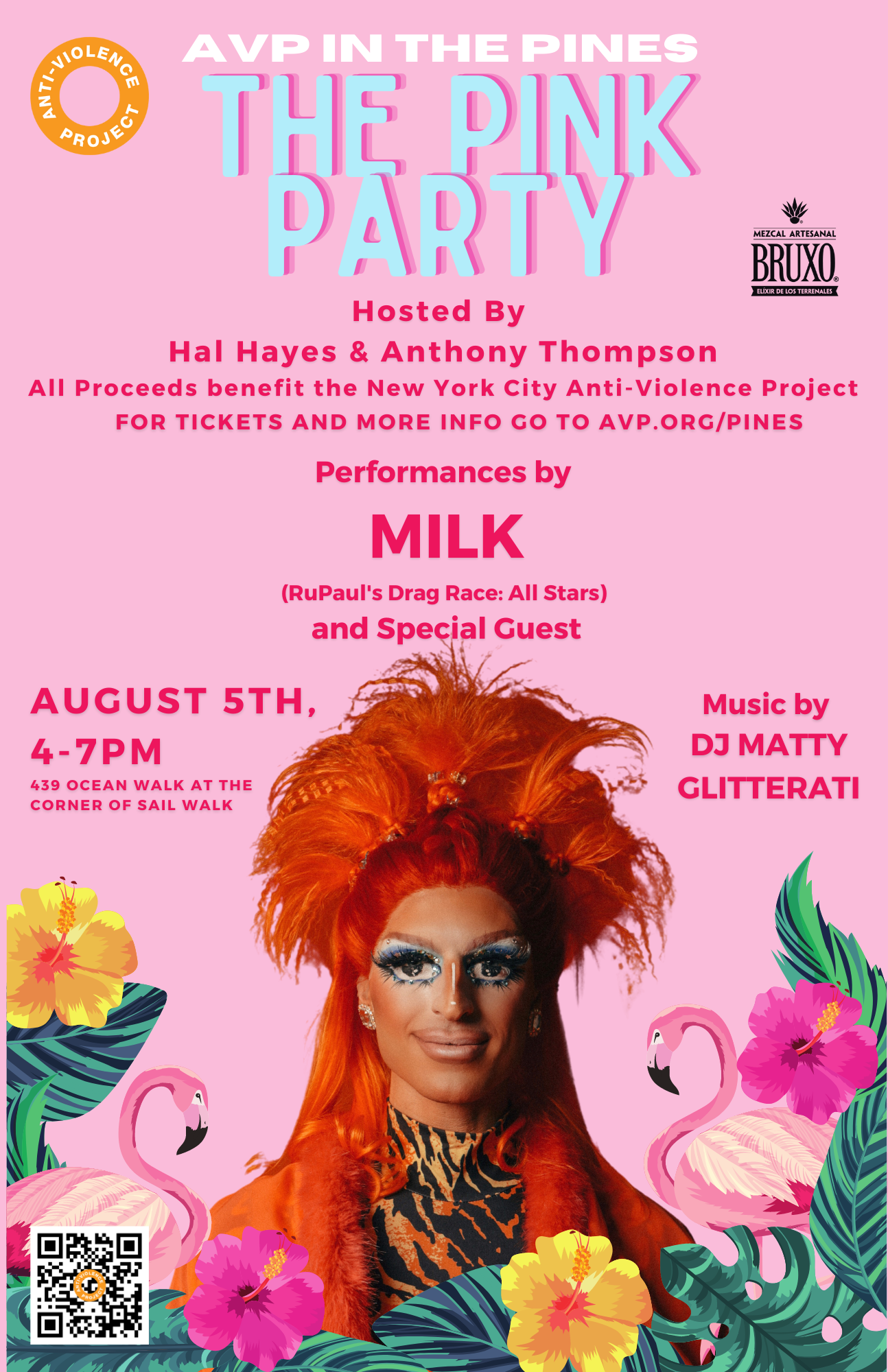 Join us as we celebrate the lives and victories of the LGBTQ community in Fire Island. The event features a performance by Milk of RuPaul’s Drag Race: All Stars and DJ Matty Glitterati. Hosted by Hal Hayes and Anthony Thompson, drink, eat, and dance with us this summer! All proceeds from the Pink Party benefit AVP. Thanks to Blush Sponsors Andrew Mitchell-Namdar and Ricardo Doriott, and drink sponsor Bruxo Mezcal!